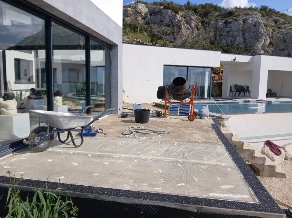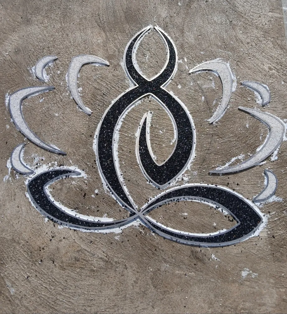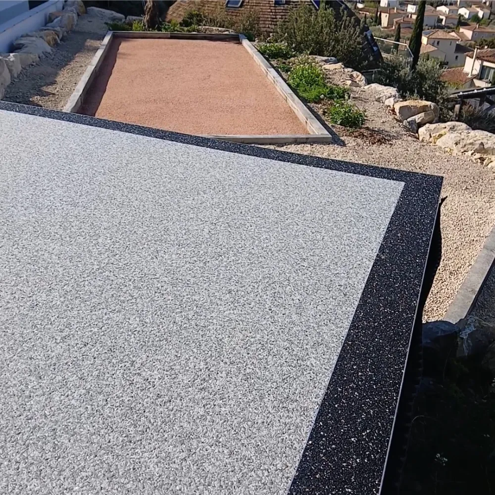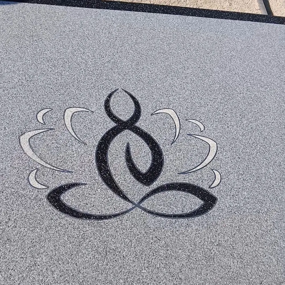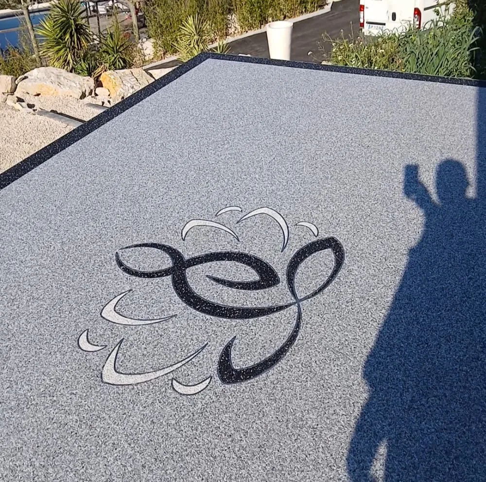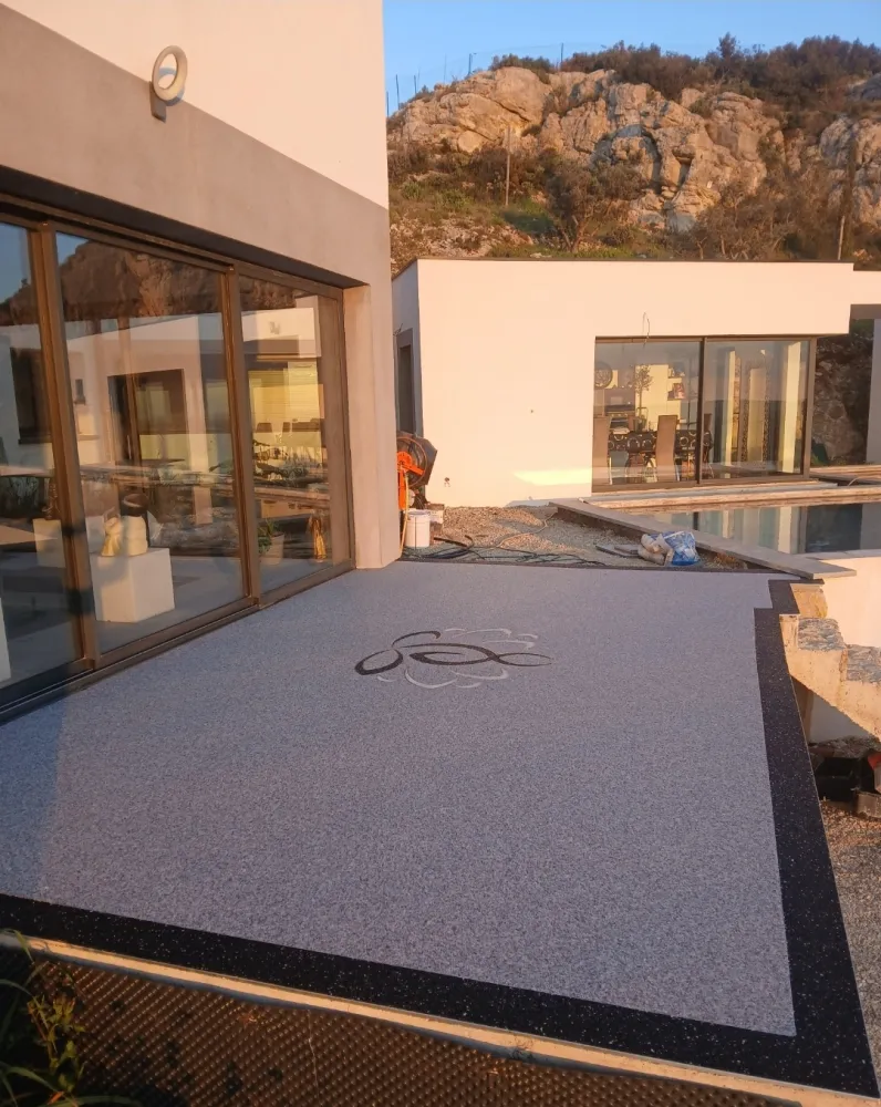 Votre entreprise de revêtement de sol en résine à Avignon Vaucluse-84, a réalisé la pose d’un tapis de pierre en granulats de marbre autour d'une maison en procédant au ponçage et dépoussiérage, la pose de profilés en finissant par l'installation de la moquette de pierre de couleur gris clair avec une bande de couleur noir motif Lotus de couleur noir et blanc