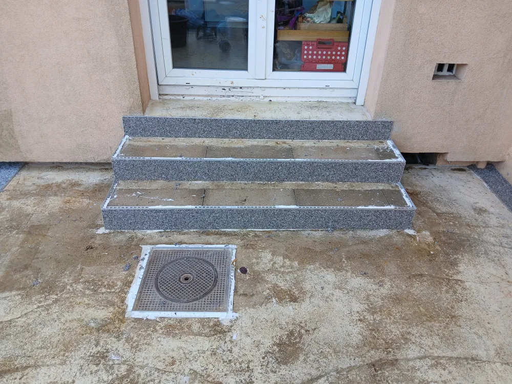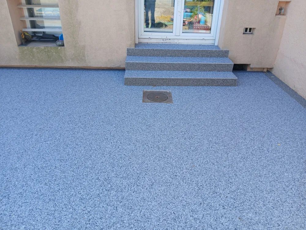 Votre spécialiste des revêtements de sols en résines à Avignon Vaucluse-84, a réalisé la pose d’un tapis de pierre sans raccords en granulats de marbre en procédant au ponçage et dépoussiérage, la pose de profilés en finissant par l'installation de la moquette de pierre de couleur gris clair avec une bande de couleur gris anthracite, un petit escalier plats des marches gris clair, contre-marches gris anthracite.