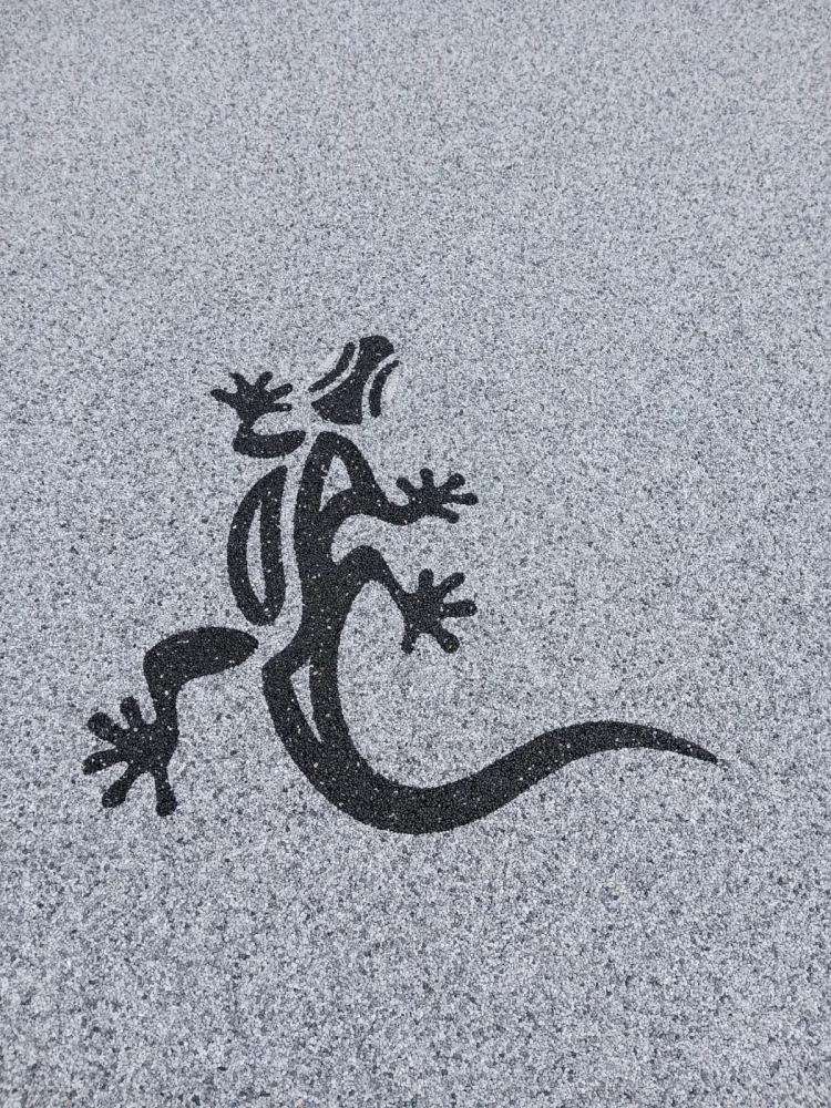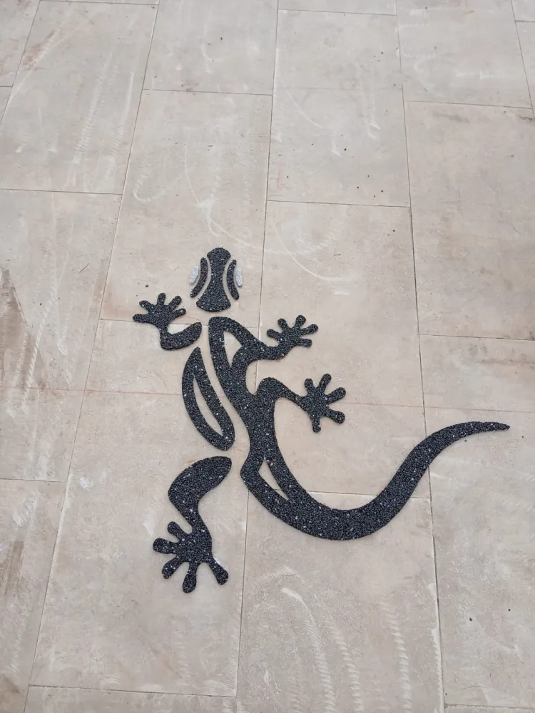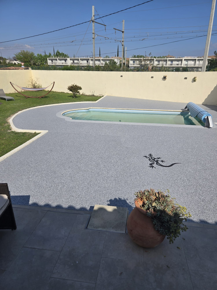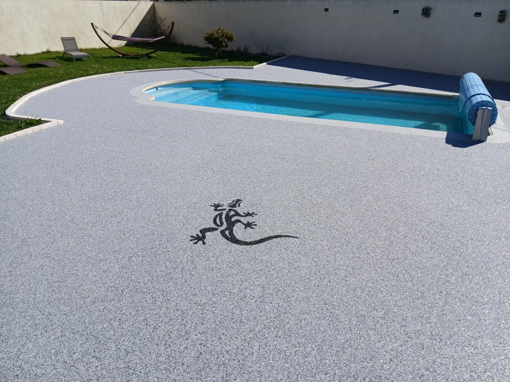 Votre entreprise de revêtement de sol en résine à Avignon Vaucluse-84, a réalisé la pose d’un tapis de pierre en granulats de marbre autour d'une piscine en procédant au ponçage et dépoussiérage, la pose de profilés en finissant par l'installation de la moquette de pierre de couleur gris clair avec une bande de couleur blanc autour de la piscine motif salamandre noir.