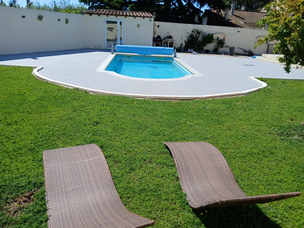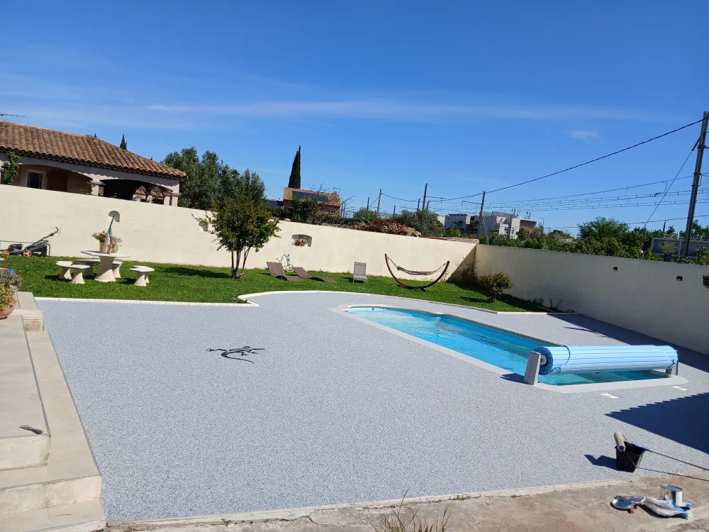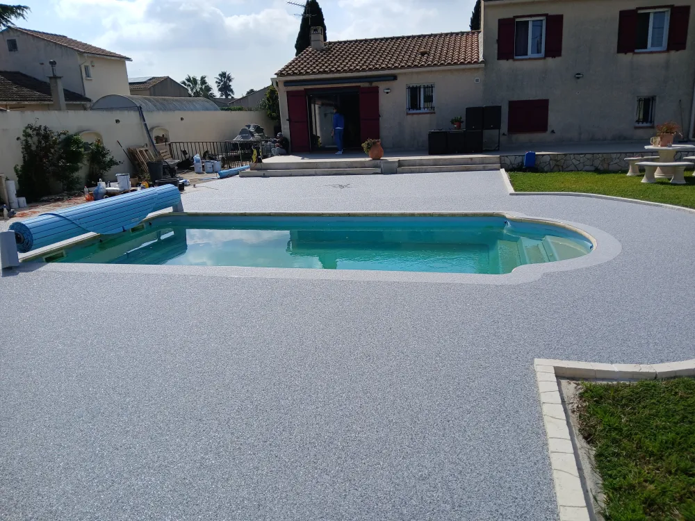 FW.RESINE a réalisé la pose d’un tapis de pierre sur le contour d'une piscine dans la ville de Istres (Bouches-du-Rhône-13).